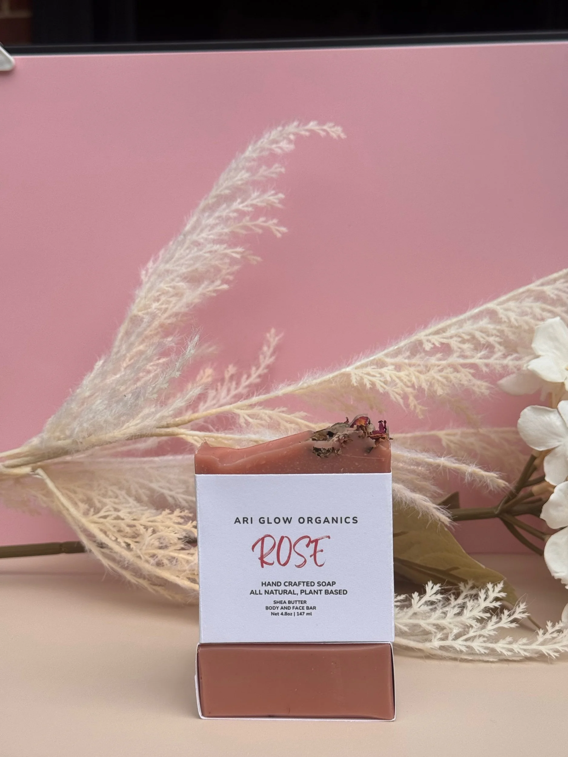 Ingredients: Saponified Extra virgin olive oil, Coconut oil, Castor oil, Shea Butter, Sweet almond oil, Rose kaolin clay, Rose petals, Blend of Palmarosa, Lavender, Jasmine, Magnolia and Cedarwood essential oils.